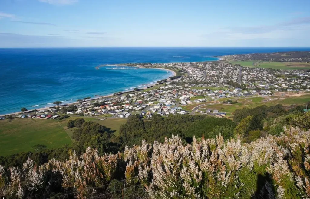 Marriners Lookout is somewhat hidden in the lush green hills behind the village of Apollo Bay. A short path leads you from the car park to this beautiful spot. From there, you have a fantastic view of the azure blue crescent of Apollo Bay.